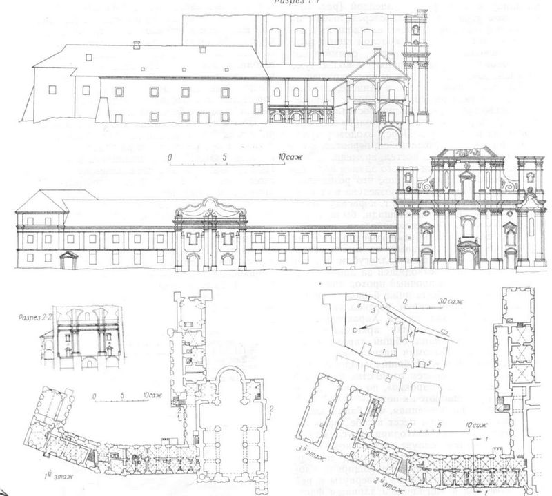 Абмерныя чарцяжы 1833, якiя акрамя планаў уключаюць фасады i разрэзы збудаванняў, выкананы больш дасканальна i адлюстроўваюць значныя пашкоджаннi комплексу. На гэты час ужо было разабрана ўсходняе крыло калегiума, касцёл паўстаў без даху з абрынуўшымiся скляпеннямi галоўнай навы, паўзруйнаванымi франтонамi i завяршэннямi вежаў.