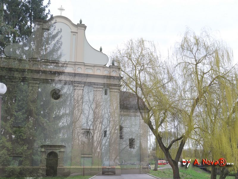Аднак польская даследчыца М. Брыковска слушна лiчыць, што першапачаткова фасад касцёла быў двухвежавы. Неабходна адзначыць што, верагодна, прапорцыi верхнiх чацверыкоў вежаў былi некалькi iншымi, больш груваздкiмi i аскетычнымi, як тыпiчныя ўзоры "сармацкага барока". Трансэпт у бажнiцы адсутнiчаў, але кампазiцыю храма ўзбагачалi вялiкiя, амаль квадратныя ў плане дзве купальныя каплiцы (дабудаваныя пазней), размешчаныя сiметрычна з абодзьвух бакоў па папярочнай восi ў цэнтры асноўнага аб'ёма бажнiцы. Наяўнасць каплiц таксама характэрна для будаўнiцтва дамiнiканскага ордэна.