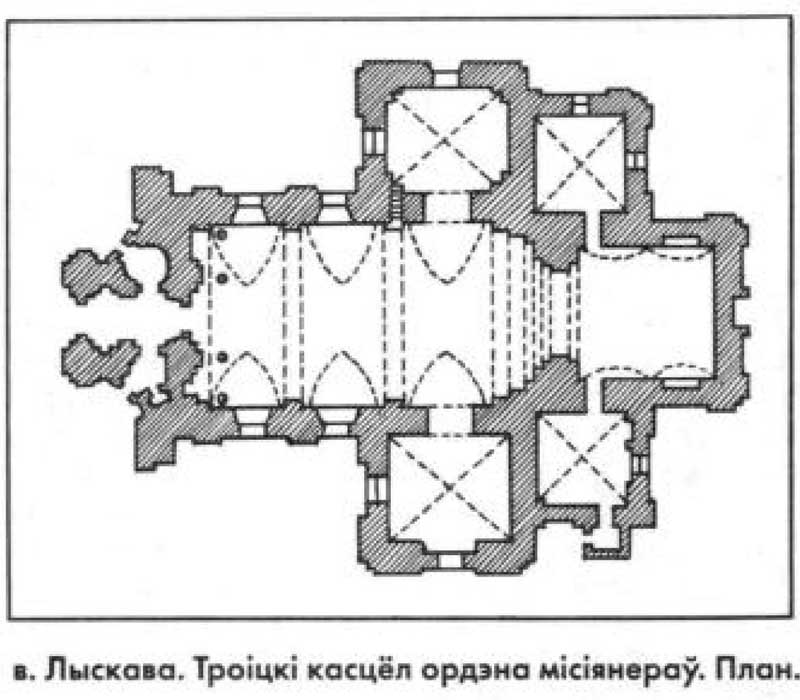Цікава параўнаць Лыскаўскі касцел з місіянерскім касцелам св. Вінцэнта у Смілавічах, пабудаваным крыху раней па фундацыi Мiрабелы Завiшы, што уяўляў сабой тыповую трохнававую базiлiку без трансепта з двухвежавым фасадам-нартэксам у стылi вiленскага барока.