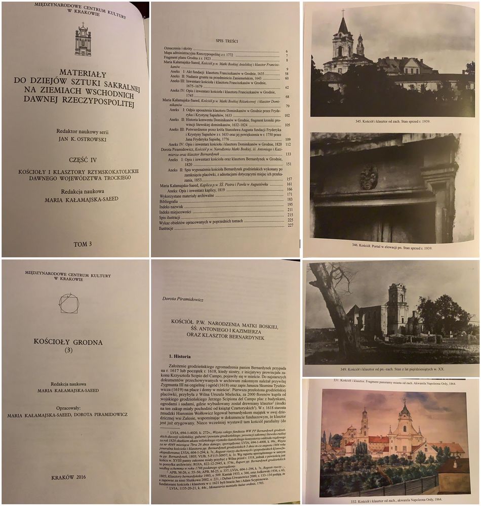 Графiчныя рэканструкцыi зроблены на падставе захаваўшыхся архiўных дакументаў (абмерныя чарцяжы, планы, схемы, праекцыi ў супастаўленнi з захаваўшымiся старымi фотаздымкамi i iншымi выявамi (малюнкамi Томаша Макоўскага, Юзафа Пешкi, Напалеона Орды i iнш.).