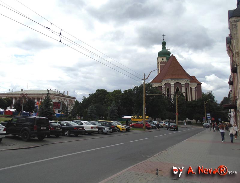 Гiпатэтычная графiчная рэканструкцыя былога фарнага касцёла — Фары Вітаўта, — на перыяд пачатку XVIIст. (першапачатковы выгляд мураванай святынi да пазнейшых перабудоў).