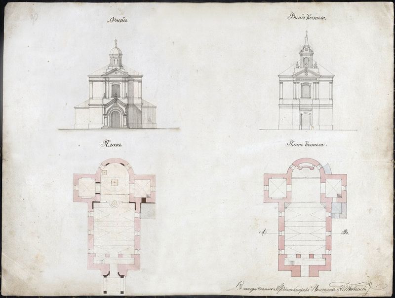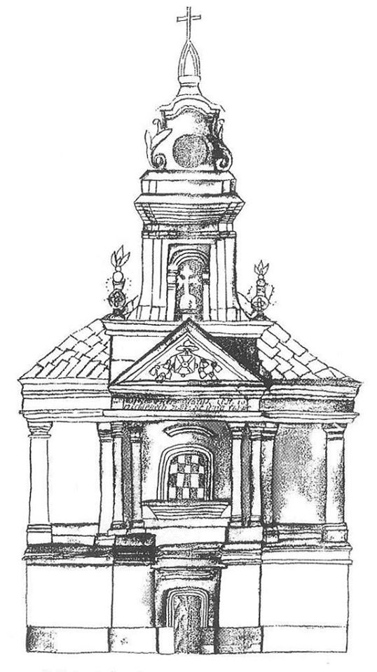 Новадзевяткавiчы. Графiчная рэканструкцыя касцёла Св. Апосталаў Пятра і Паўла. Выгляд на сярэдзiну XIX ст. да перабудовы пад праваслаўную царкву.