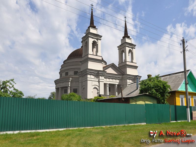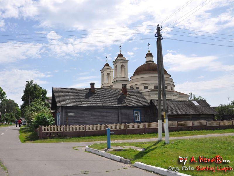 Чачэрск (Гомельская вобласць). Графiчная рэканструкцыя Царквы Нараджэння Божай Маці ў ансамблi культавых пабудоў разам з былым паезуiцкiм касцёлам Св. Тройцы. Выгляд на пачатак XIXст.