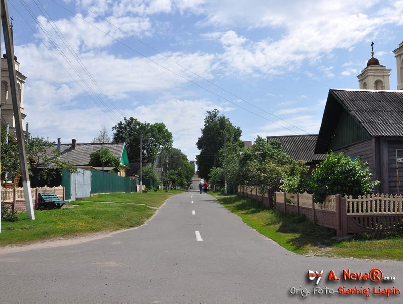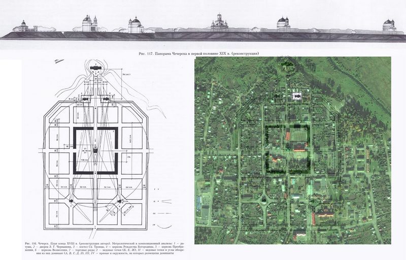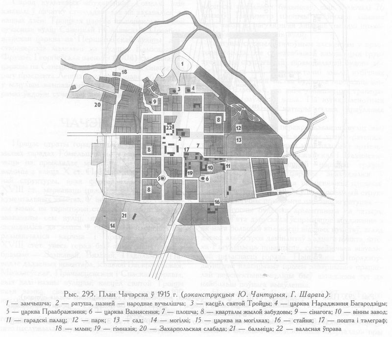 На паўночнай ускраiне галоўнай, мерыдыянальнай восі на месцы замка месцiўся палац З.Р. Чарнышова. Гэтая вось фланкіравалася дзвума парамі культавых дамінант (касцёл i царква), якія мелі кампазіцыю ў выглядзе ратонды з купалам, вежамi і бабінцам. Пры ўездзе ў горад з поўдня два iншых храма былі сіметрычна аддаленыя ад восі на адлегласць квартала і знаходзіліся на малых квадратных плошчах. Інтэрвал паміж іншымі дзвума дамінантамі на квадратнай плошчы паблізу палаца быў значна паменшаны так, што яны стварылі перад ім своеасаблівыя Прапілеі..."