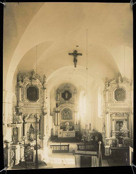 Знутры будынак меў "нягладкiя старасвецкiя" скляпеньнi, сцены былi атынкаваны i часткова распiсаны. Побач з прэсбiтэрыям знаходзiлася сакрыстыя са скляпенiстым перакрыццём, а пад ёю скарбнiца. Пад падлогай з квадратнай цэгля знаходзiлiся чатыры ганаровыя пахаваннi.