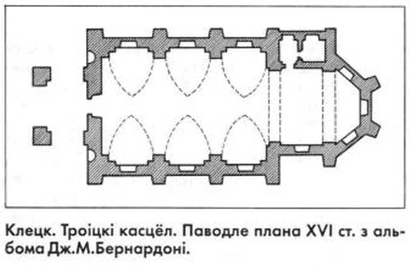 Першае графiчнае адлюстраванне святынi захавалася на гравюры Клецка, выкананай Томашам Макоўскiм на мяжы XVI-XVIIcт., яго дапаўняе план касцёла з "альбома Бернардонi" з надпiсам на лацiнцы "Касцёл месца клецкага пана маршалка" (маецца на ўвазе стрыечны брат Сiроткi ардынат клецкi Альбрыхт Радзiвiл, якi з 1585г. быў маршалкам ВКЛ) - адзiны вядомы на сёняшнi дзень план фарнага Троiцкага касцёла ў Клецку, датуемы 1585-1592гг.