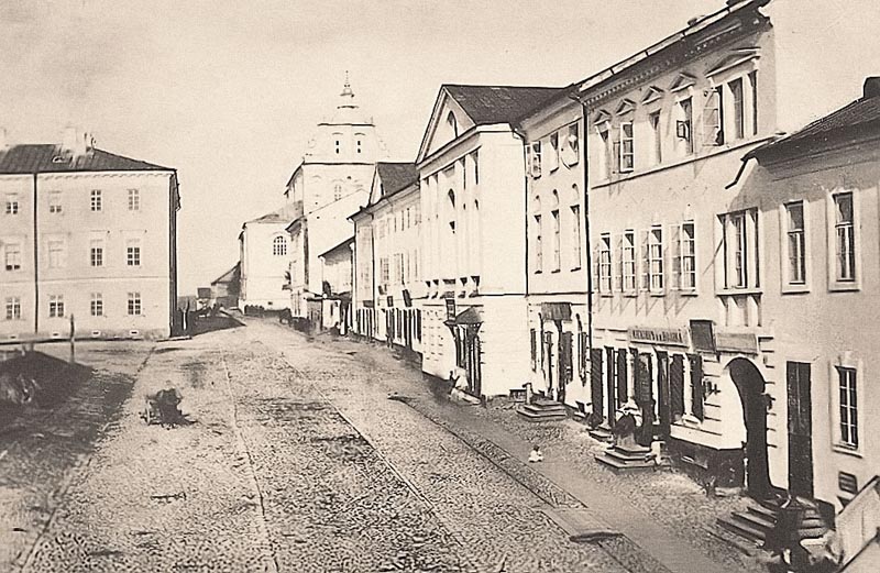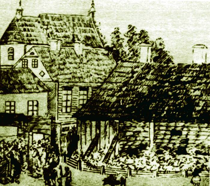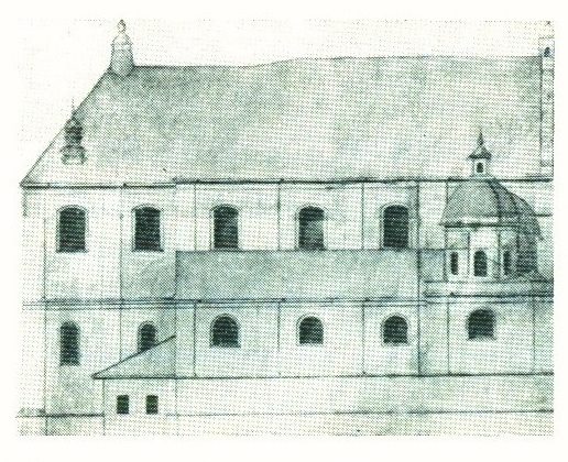 Менск. Касцёл Святога Тамаша Аквінскага дамініканскага кляштару. Графiчная рэканструкцыя на перыяд пачатку XIX стагоддзя.