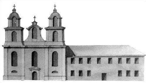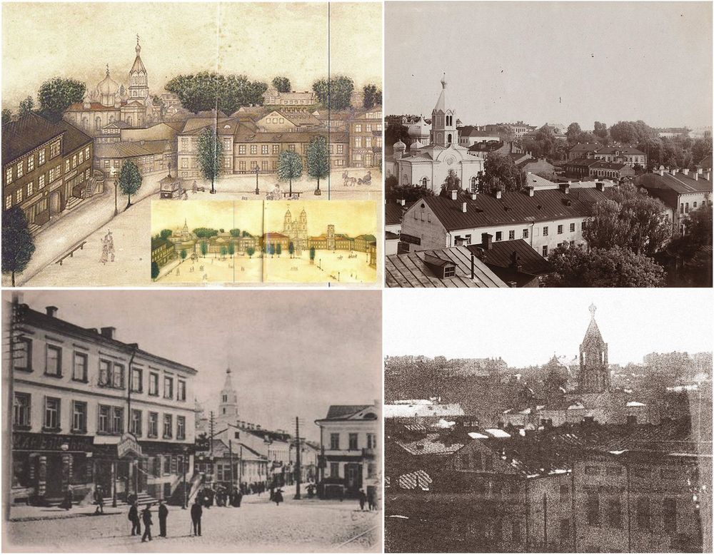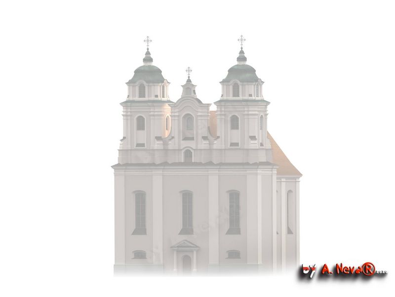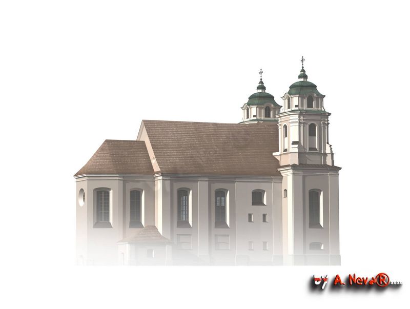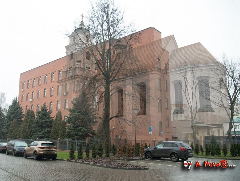 Менск. Графiчная рэканструкцыя касцёла Святога Войцэха кляштару бенедыктынак. Выгляд на сярэдзiну XIXст. да перабудовы на царкву.