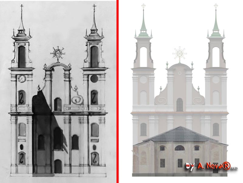 Аздоба касцёла вялася пад кіраўніцтвам архітэктараў езуітаў Габрыэля Лянкевіча — у 1747-48 гг. і Францішка Каро — ў 1757-58 гг. У 1747г. кансекрацыя святынi. У 1773г. ордэн езуiтаў быў скасаваны, кляштар лiквiдаваны. Пасля скасаваньня Ордэну па ўсей Эўропе, езуіты захавліся толькі на парэштках ВКЛ, захопленых Рассіяй. У гэты час і Лянкевіч (1785—1798) і Каро (1799-1802) былі генеральнымі вікарыямі Ордэну (выканаўцамі абавязкаў генерала).