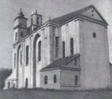 Княжыцы. Гiпатэтычная графiчная рэканструкцыя касцёла св.Антонiя былога дамiнiканскага каляштара. Выгляд на сярэдзiну XIX ст., да перабудовы пад праваслаўную царкву.
