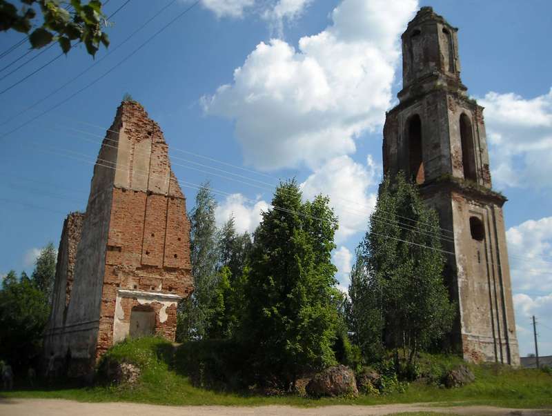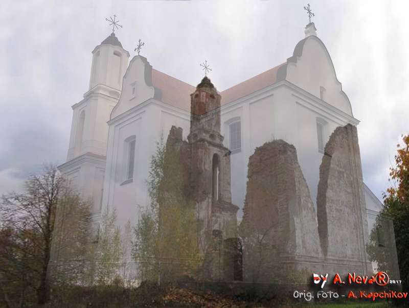 З некалі былога велічнага касцёла засталіся толькі вежа і рэшткі муроў, якія так і не змаглi разбурыць.