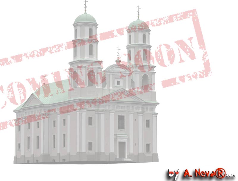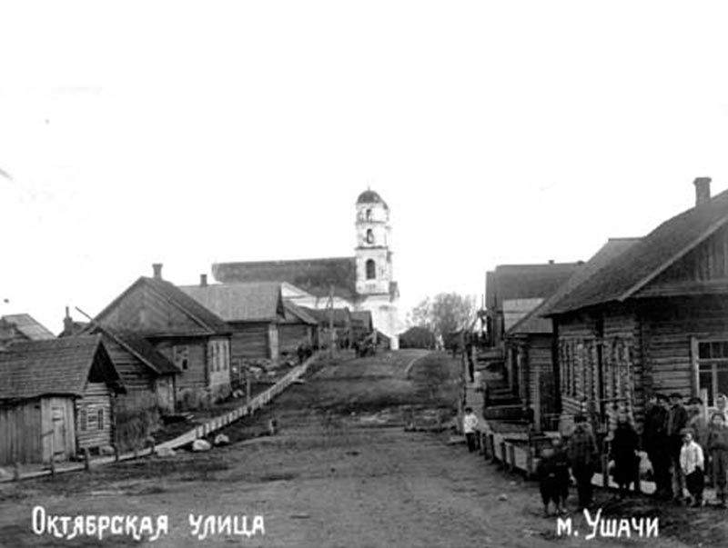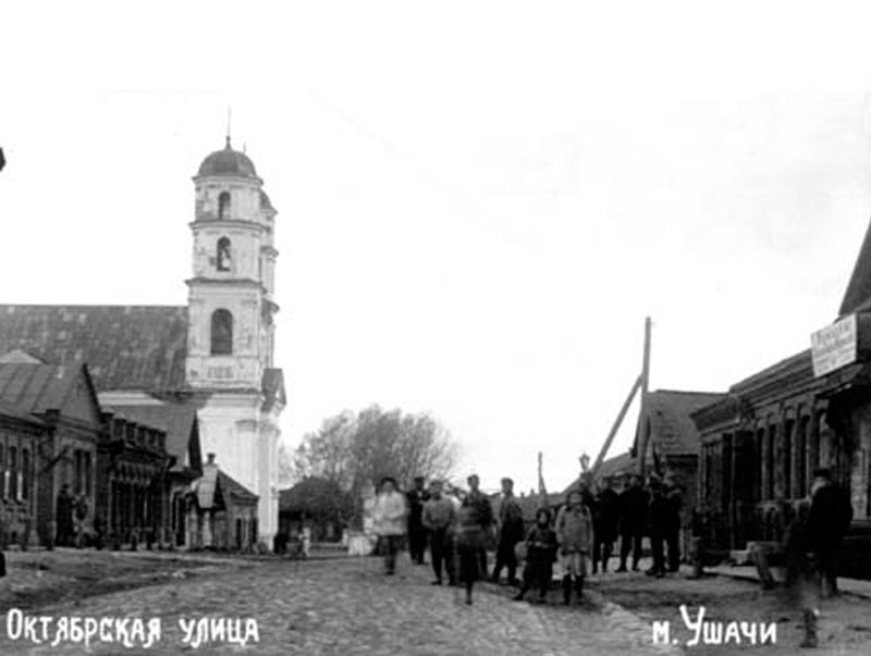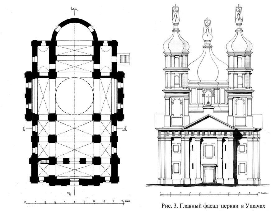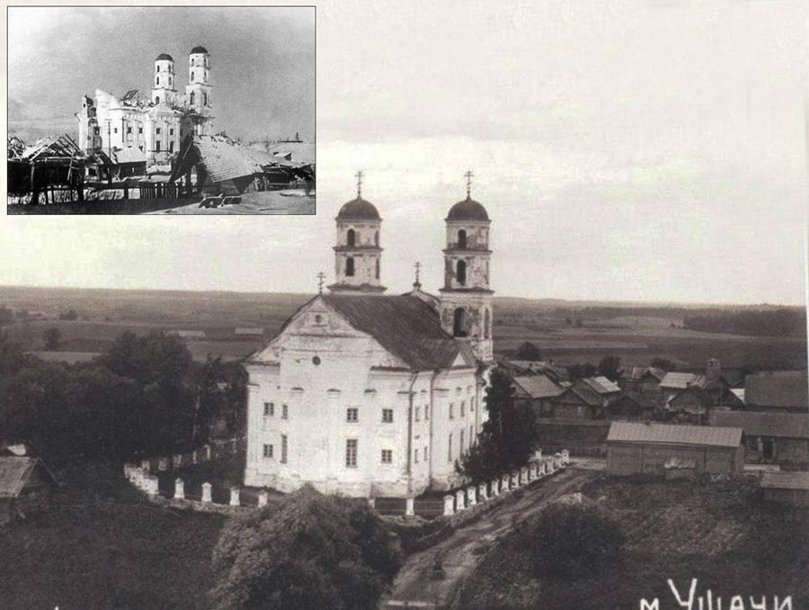 Ушачы. Графiчная рэканструкцыя былога дамiнiканскага касцёла св. Геранiма. Выгляд на пачатак XX ст., калi касцёл быў ужо прыстасаваны пад царкву РПЦ.