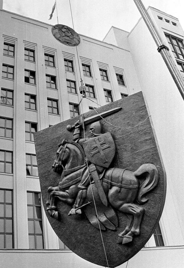 Напрыканцы нашай працы да нас прыязджалі літоўцы. Яны ў гэты час перараблялі свой даваенны герб і хацелі ўпэўніцца, што мы не ўкралі іх ідэю. З’ехалі яны задаволеныя, бо ў геральдыцы існуе правіла: дастаткова змяніць адну дэталь – і гэта ўжо новы герб. У іх і колер другі, і крыж роўнаканцовы, нават хвост у каня інакш намаляваны, чым у нас, вельмі шмат адрозненняў.