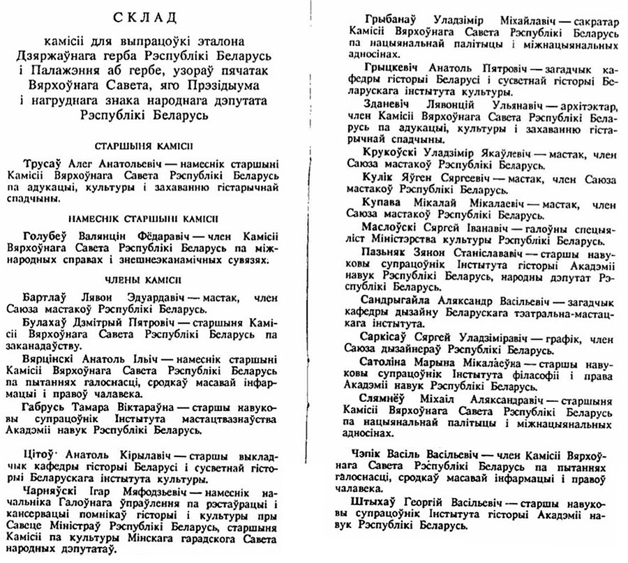 Са спецыяльнай камісіі была вылучана група мастакоў, якія разбіраліся ў геральдыцы, — у яе ўвайшлі Яўген Кулік, Мікола Купава, Лявон Бартлаў, Леў Талбузін і я. Праз нейкі час Купава заняўся дзяржаўнымі пячаткамі, Талбузін – рэльефам, аб’ёмным эталонам, а мы з Куліком фактычна стварылі фінальны варыянт герба.