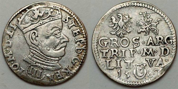 (в. князь 1575-1586) на монете чеканили уже полный герб Речи Посполитой.