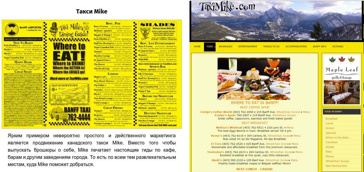 О том, что в своей рекламе можно писать не толко про себя и работать успешно, свидетельствует опыт компании TaxiMike — канадского такси Mike, рассказывающей о барах и кафе своего города (до которых, в общем-то, можно добраться и без их помощи)