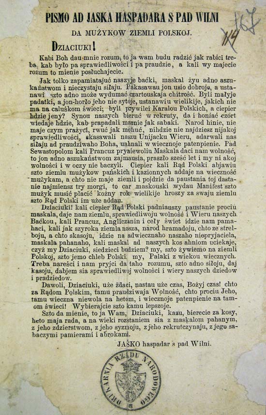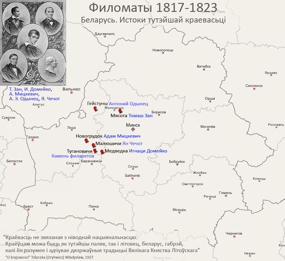 Со времен Люблинской унии 1569 года польский язык начинает доминировать в шляхетской среде. Тогда же белорусский язык получает (помимо кириллицы и арабского) еще и латинское написание. В 1795 польский становится государственным языком и, наряду с латынью, языком обучения — языком горожан и аристократии (как русский сегодня). С этого времени все польскоязычные уроженцы Беларуси зачисляются в польский пантеон славы. Как филоматы и Мицкевич — литвин, никогда не бывший в Польше.