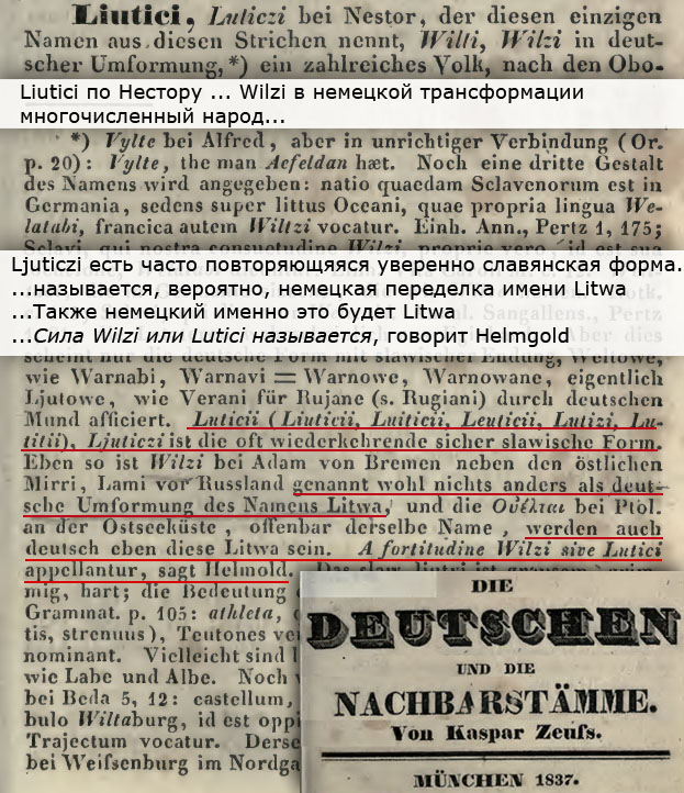 "Немцы и их соседи" Йон Каспер Цойсса — источник часто встречающихся в сети цитат о Пруссах, Ятвягах, Венедах, Вильцах-Лютичах. Обобщая труды немецких и польских хронистов, он подробно описывает расселение и этимологии названий народов.