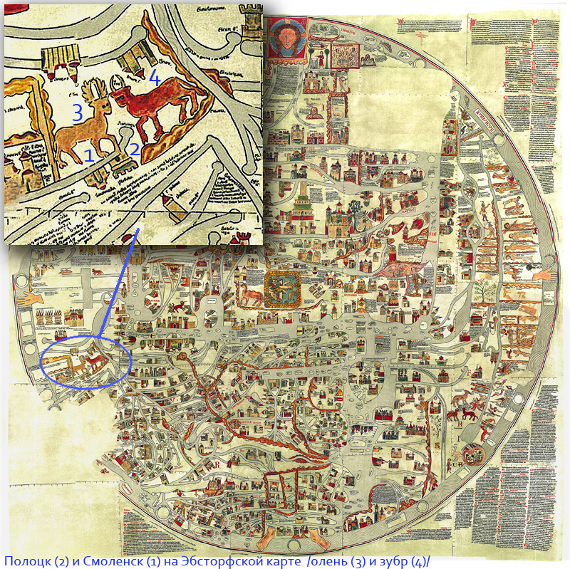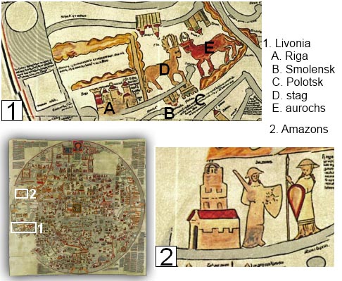 Excerpt 1 shows Livonia and the Dvina (or Daugava) River, at which banks three cities are depicted: Riga (A), Smolensk (B) and Polotsk (C). While Riga and Polotsk are indeed located at this river, Smolensk is in verity further east and not at the Dvina River but at the Dnjpr River. This inaccuracy may be owed to the fact that treaties were concluded in Smolensk in 1229 and 1250, which opened up German-Russian trade on the Dvina River between Riga and Polotsk. Thus, the mediating role of Smolensk was translated literally into a geographical dependence. But not all details are wrong. At the source of the Dvina River in Russia, a stag (D) and an aurochs (E) are depicted. Recent research by Stanford osteologist Krish Seetah has confirmed the former presence of an aurochs population in this region, which is now extinct.