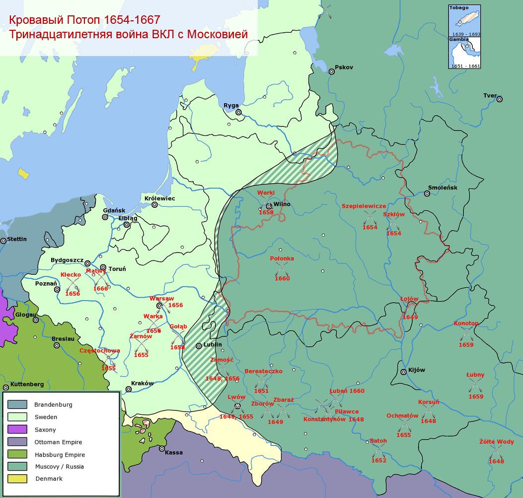 Карты войн, в которых Шведские войска заходили вглубь территории Речи Посполитой. "Кровавый Потоп" 1654-1667 годов