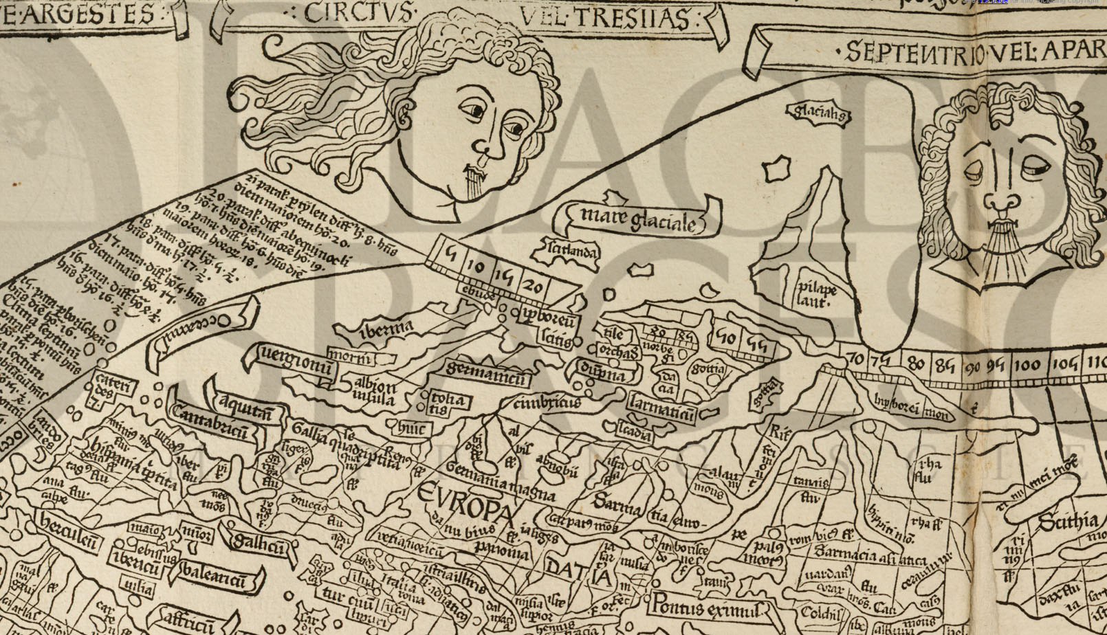 Ниже представлены карта гравера Йохана Шнитцера из Армсхайма (1482), выполненная по «Космографии» Птолемея и ее фрагмент.