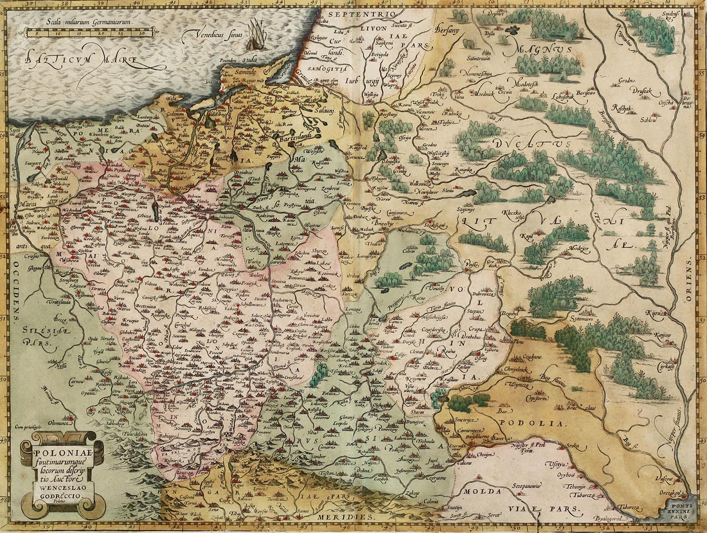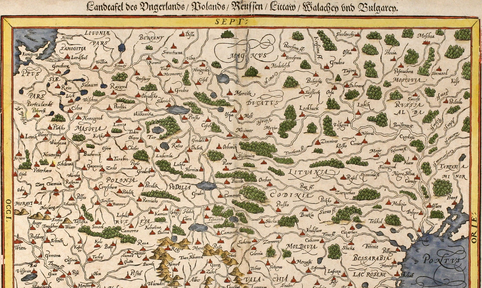 На этой карте Litvaniae (ВКЛ) — расположена вокруг моря Геродота. Города — Вильня, Гродно, Пинск, Копыль, Новогрудок