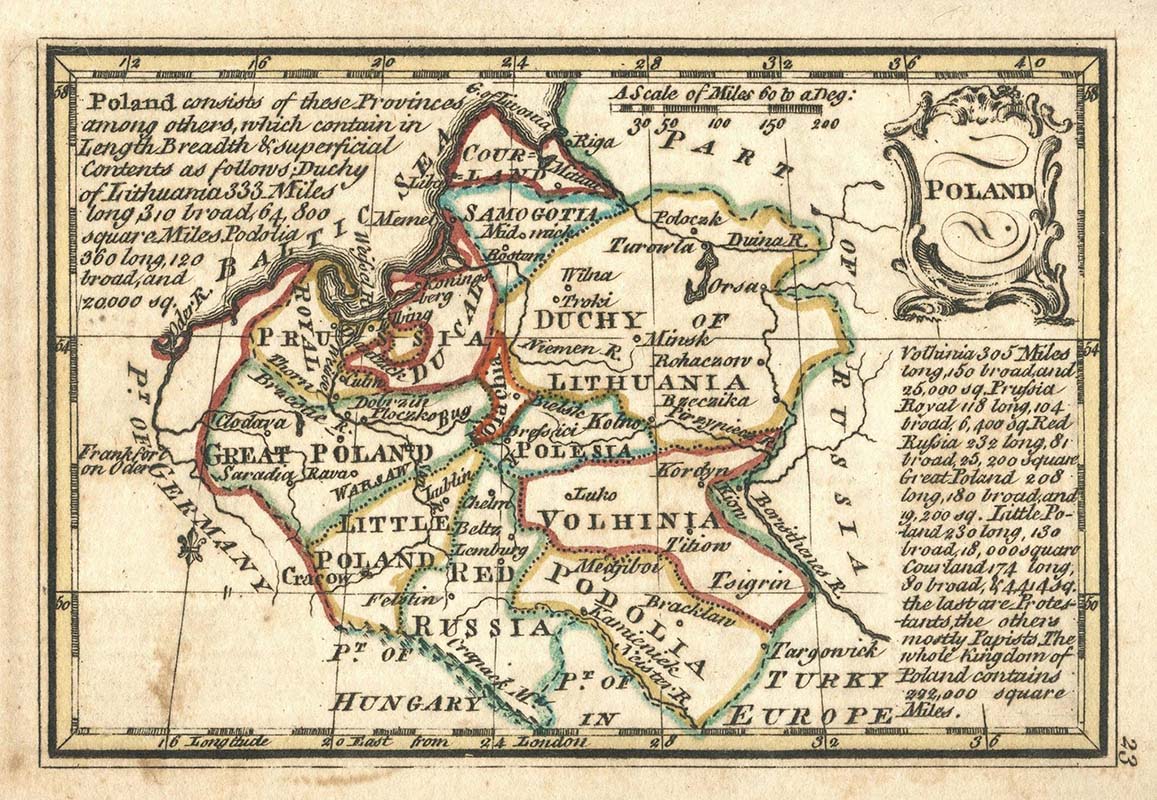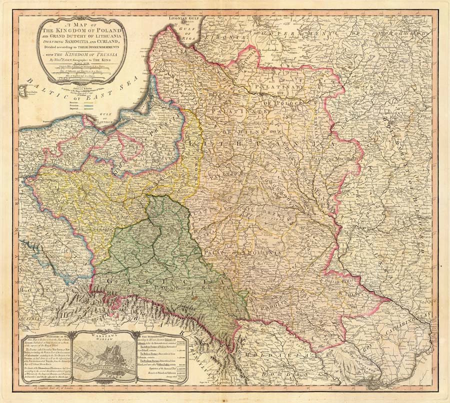 Карта разделов Речи Посполитой. "The Kingdom of Poland and Grand Dutchy of Lithuania including Samogetia and Curland". На карте отмечены границы и годы трех разделов страны — 1772, 1793 и 1795 гг. Составлена и издана "по горячим следам" — через 4 года после третьего разела Речи Посполитой.