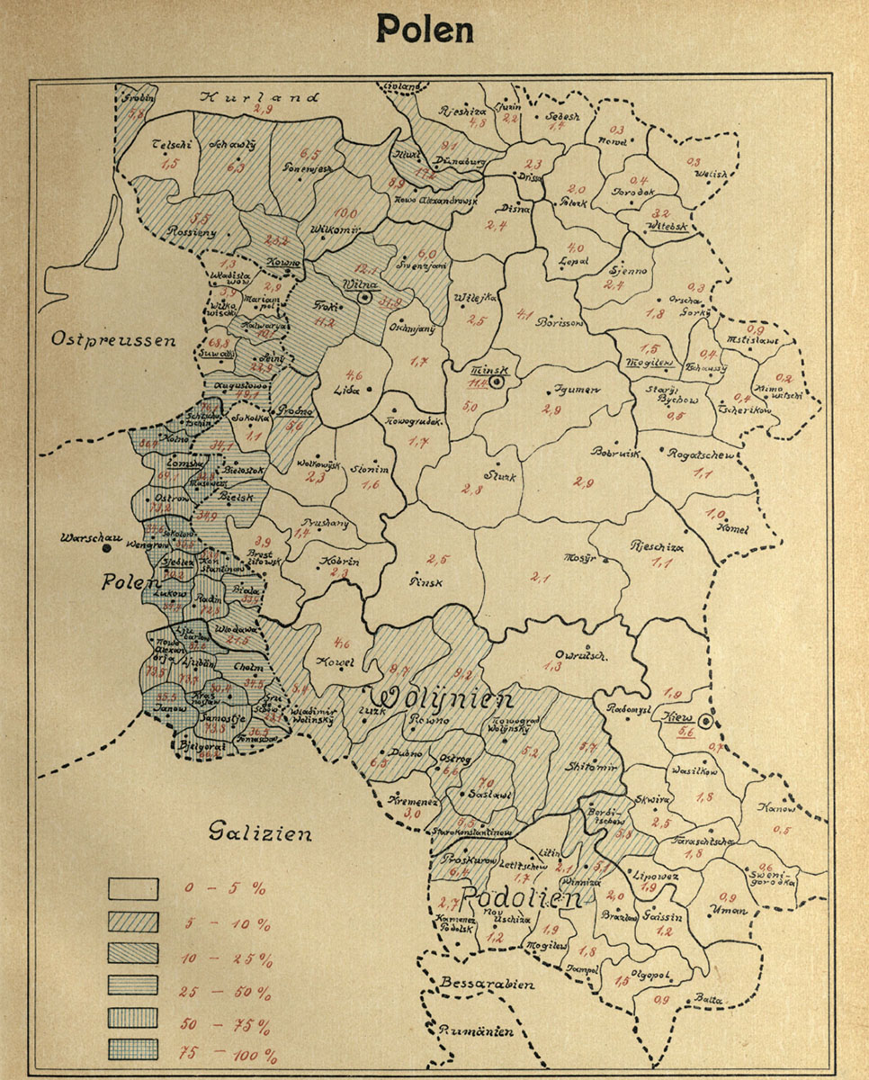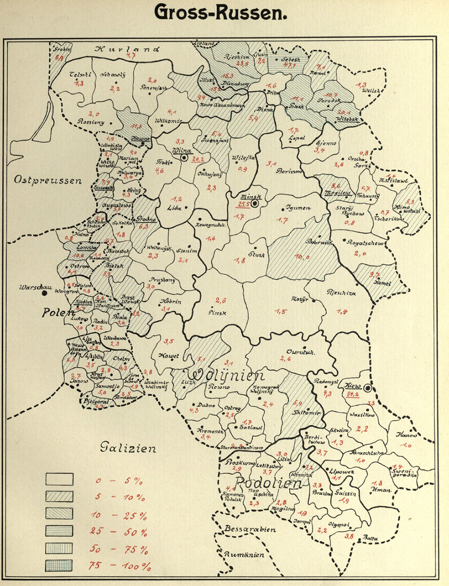 И, конечно, большой процент габрэев — еврейского населения. "Черта постоянной еврейской оседлости" в Российской империи — граница, далее которой постоянное проживание иудеев запрещалось — проходила по восточной границе Западного края.