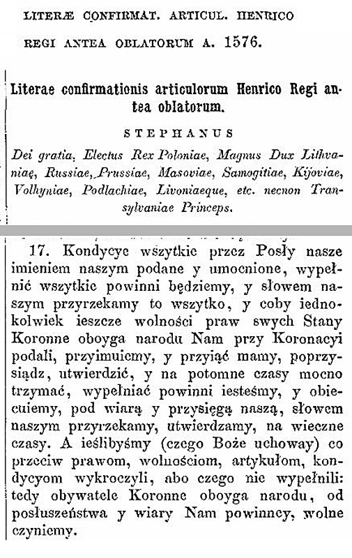 [ §17 ...A ieslibysmy (czego Boze uchoway) co przeciw prawom, wolnosciom, artykulom, kondycyom wykroczyli, abo czego nie wypelnili: