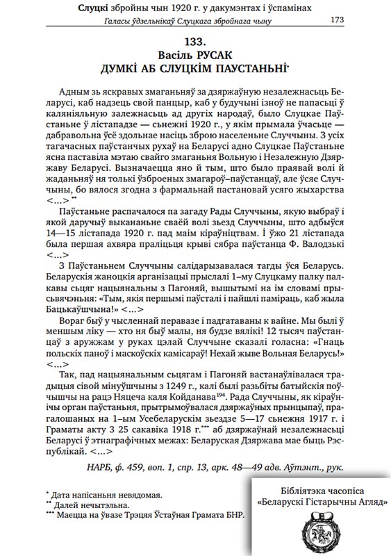 Подробная хронология и анализ событий Слуцкого збройнага чына с использованием архивных материалов приведены в работе "Беларусь мяцежная: з гісторыі ўзброенага антысавецкага супраціву: 20-я гг. XX ст.", Н. І. Стужынская. - Вільня: 2000 г.