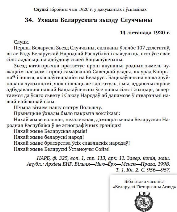 1920 (27 ноября) Слуцки Збройны чын — попытка Часовай Рады Случчыны восстановить независимость края в формате БНР. "Збройны чын" справедливо называют не "восстание", а "беларуска-расейская вайна 1920 году". В течение месяца пад зброю стали свыше 4000 человек.