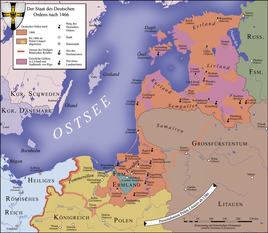 В 1237 году Тевтонский орден вобрал в себя остатки военного братства рыцарей Меченосцев (рыцарей Христа), и Ливонский Орден стал называться Ливонским ландмайстерством Тевтонского Ордена. Таким образом, к концу XIII века Орден, фактически став государством, продолжает политику экспансии на Восток. В 1309 году столицей Тевтонских рыцарей стал город Мариенбург (нем. "Замок Марии"; польск. Мальборк).