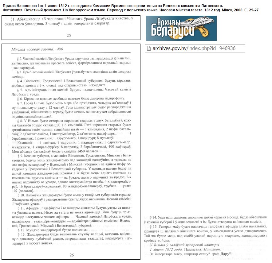 "Что касается сражений между русскими и французскими войсками, то предки беларусов участвовали в них с обеих сторон. Одни служили царю Александру, другие — императору Наполеону, а крестьяне держали оборону от мародеров со всех сторон. Именно поэтому мы не считаем ту далекую войну Отечественной. Для наших предков она скорее была гражданской.