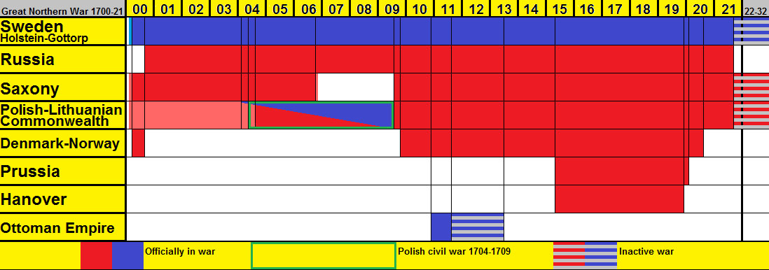 И Речь Посполитая в целом, и Великое княжество Литовское к моменту вступления в войну переживали кризис государственности. В ВКЛ шла Гражданская война между Сапегами и магнатской конфедерацией. Между королем и магнатами велась постоянная борьба, в 1715-16 годах вылившаяся в Тарногородскую и Виленскую конфедерации шляхты.