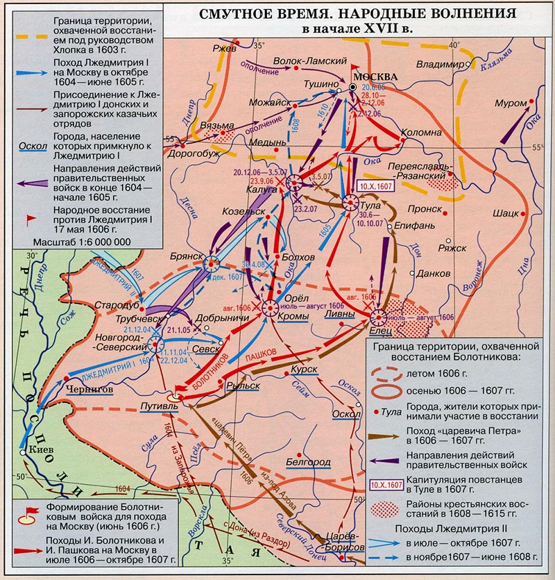 1606-1607 Крестьянское восстание Болотникова в Московском царстве. Закрепощение крестьян и голод собрали в поход на Москву до 30 тысяч человек.