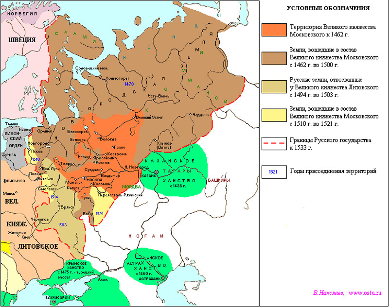 1480 год. С ослаблением Золотой Орды "ханская ставка была перенесена в Кремль"(c) и Московское княжество, оставаясь данником Крымского хана, стало расширяться — была уничтожена Новгородская Республика и захвачены Новгородская и Вятская земли, Тверское княжество. Территория Московского княжества увеличилась в три раза.