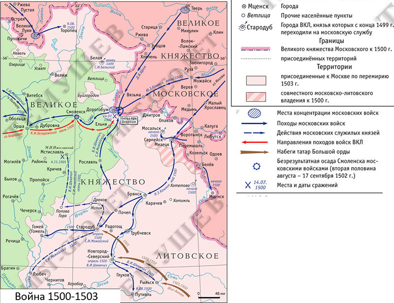 14 июля 1500 года войско ВКЛ на реке Ведрошь потерпело тяжелое поражение. Война закончилась потерей больших территорий — верховьев Оки и Днепра с 19 порубежными городами, в том числе Черниговом, Гомелем, Новгород-Северским и Брянском.