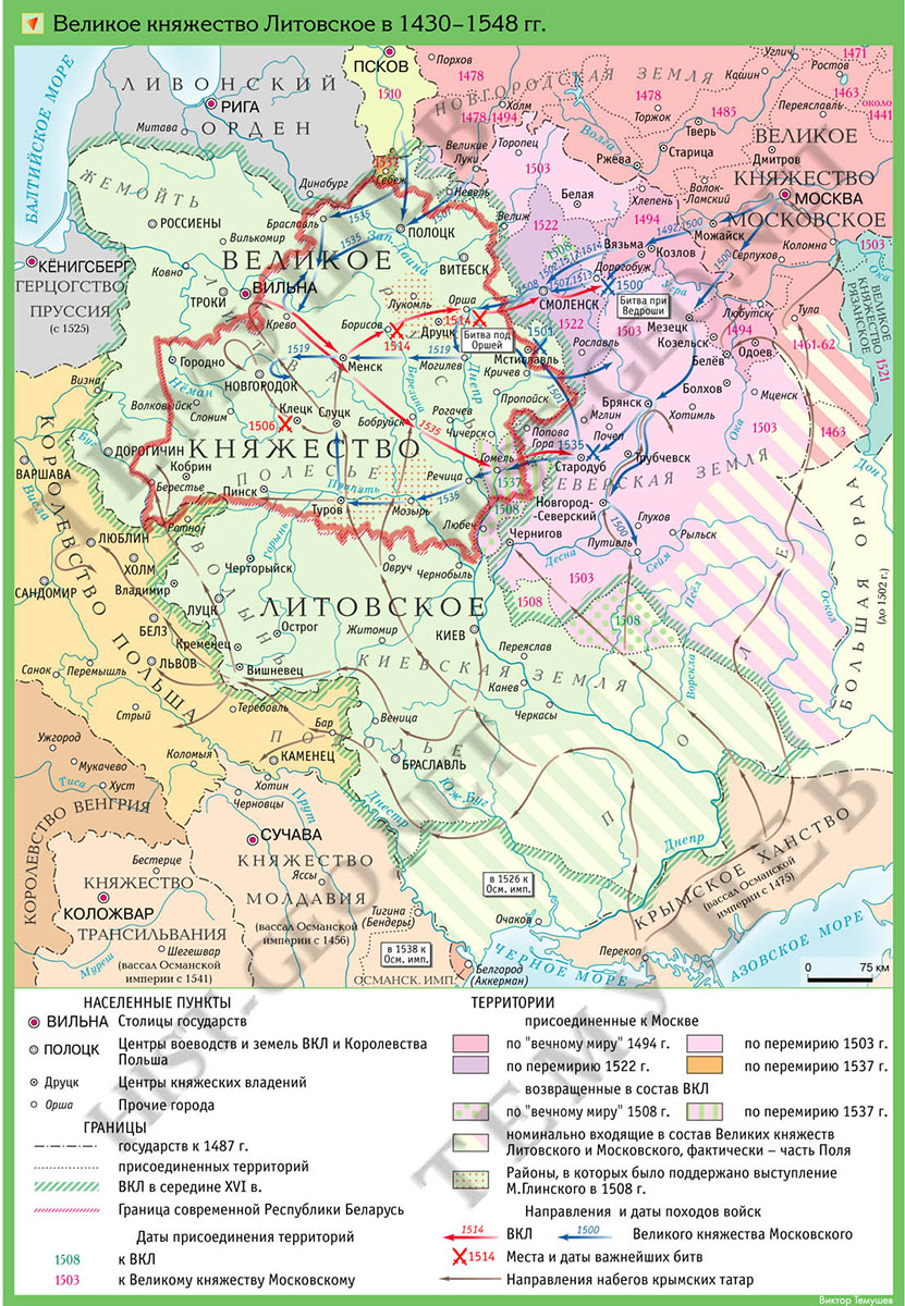 1430-1500 Границы Великого княжества Литовского после смерти Витовта (1430) и до распада Золотой Орды оставались почти неизменными. Однако после смерти хана Ахмата (1481) экспансия Московского княжества на запад привела к серии войн, определивших современную восточную границу Беларуси.