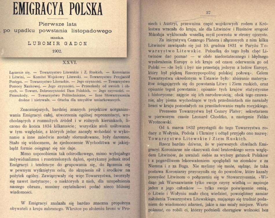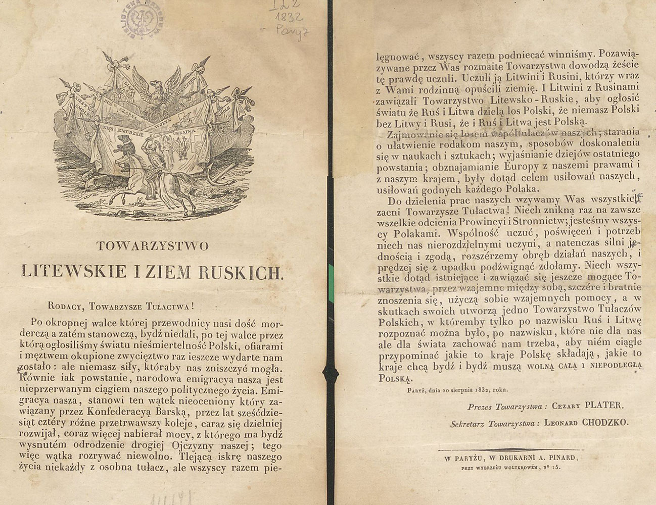 "По инициативе Цезаря Плятера и группы Литвинов, 10 января 1831 года было организовано Товарищество Литовское. Мотивом до того было желание Литвинов явить — вопреки недостаточному и бедному представлению Европы об их Крае со времен отторжения его от Польши — что они были и быть не перестают одним из народов Европы, который был прекрасной Речи Посполитой половиной."