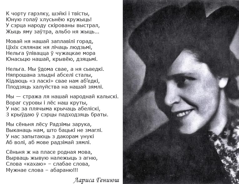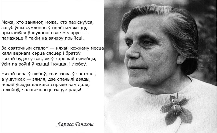 Лариса Антоновна Гениюш, в девичестве Миклашевич (9 августа 1910 - 7 апреля 1983) — белорусская поэтесса, писательница и общественный деятель.