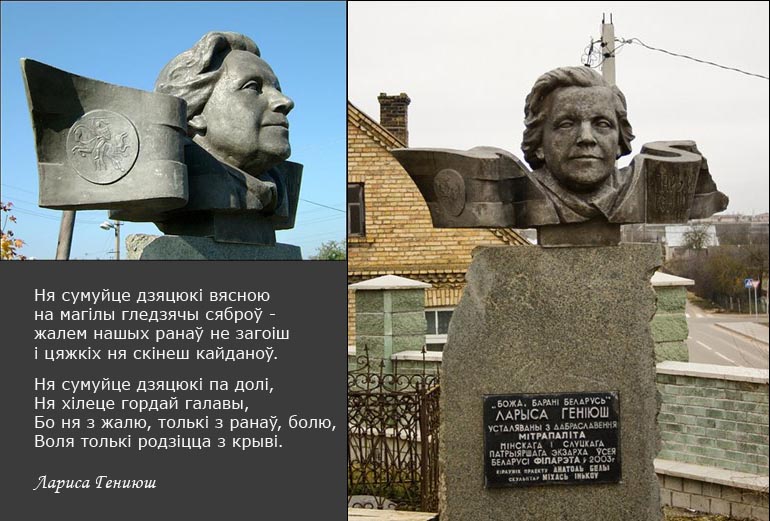 Памятник Ларисе Гениюш в Зельве — это, пожалуй, единственный памятник в РБ с символикой БНР — БЧБ-флагом и Погоней.