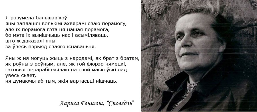 Да мяне падышоў Вітушка, сказаў, што завязе мяне да Арсеньневай. Калі апынуліся ля ягонай машыны, такога нейкага «казла», ён спыніўся й кажа: «Ларыса Геніюш, я ненавіджу немцаў, я толькі й толькі беларус, але нам трэба здабыць яе для народу, гэту зямлю нашу, і трэба нам усё дзеля гэтага выкарыстаць... Я мусяў сказаць вам гэта». — «А я й так гэта ведала»