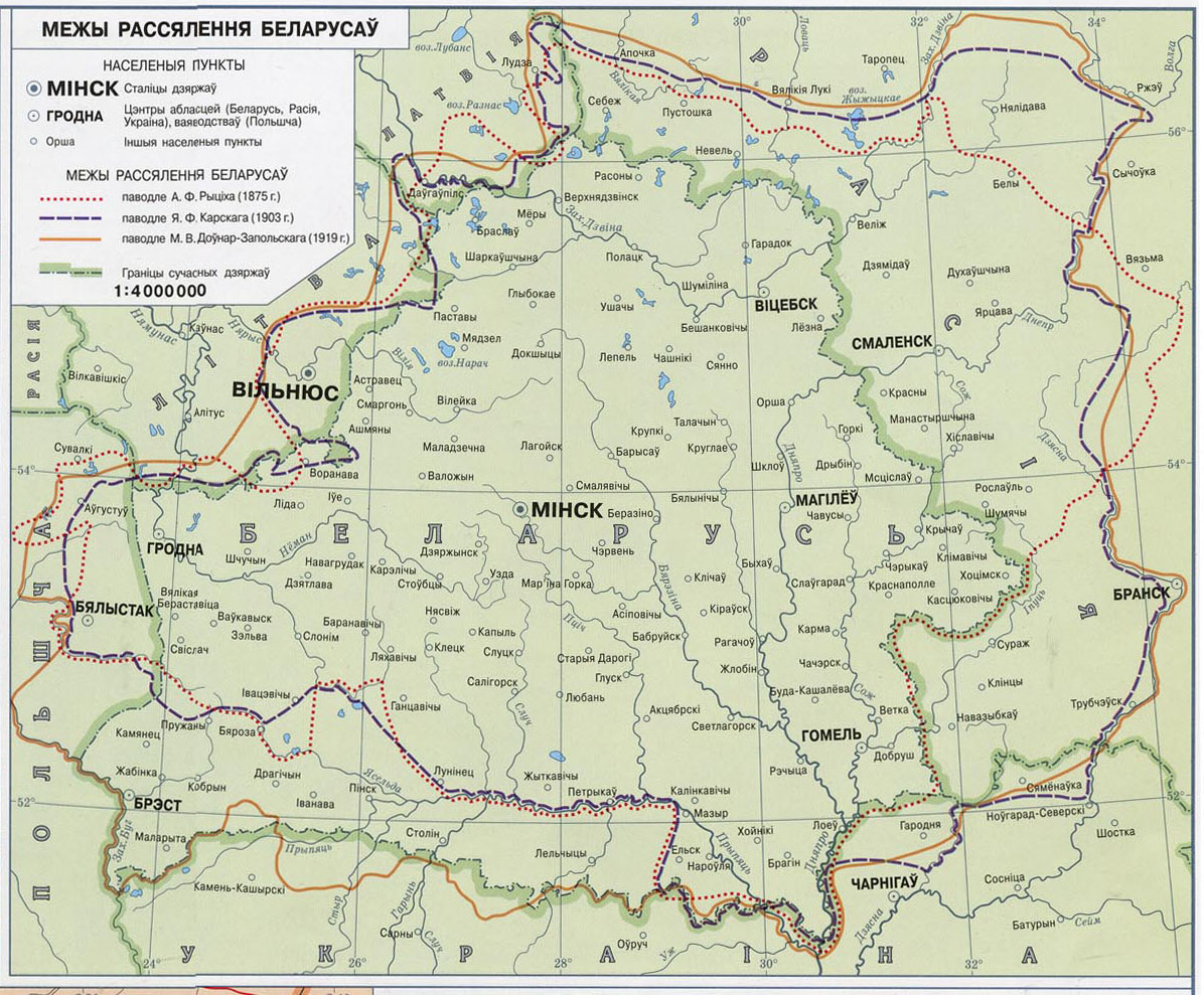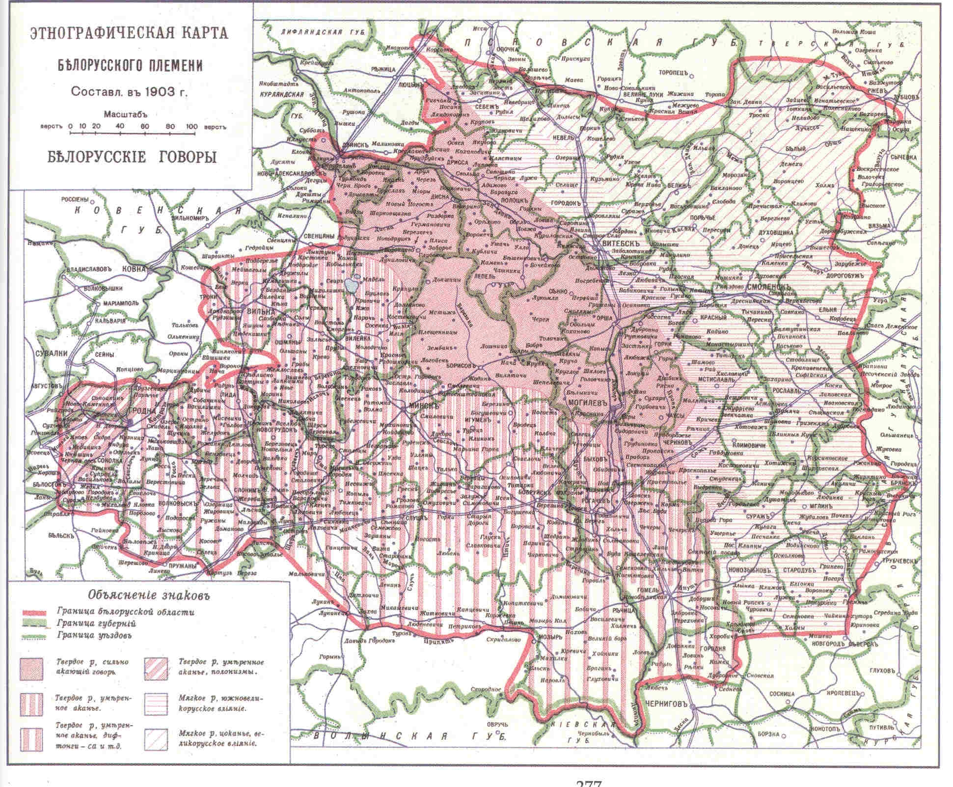 Три классические работы по определению "границ расселения белорусского племени" — "Этнографическая карта европейской России" А. Ф. Риттиха (1875) и работы Карского (1903) и Довнар-Запольского (1919) — незначительно отличаются в деталях и дают достаточно полную картину, хорошо согласующуюся с работами иных исследователей.