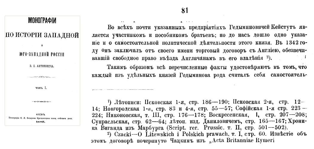 О достаточной самостоятельности Кейстута в правлении свидетельствует договор от его имени с Англией (1342), обеспечивавший свободное право въезда англичан в его владения.