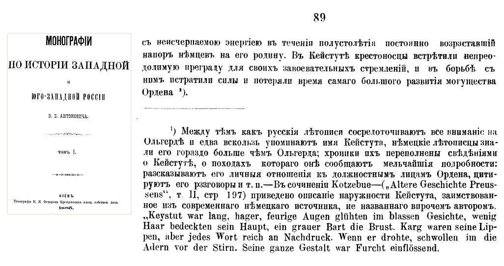 На долю Кейстута выпала охрана западной границы Литовского государства от натиска крестоносцев, и эту задачу он выполнял около полстолетия с большим успехом. Ниже приведены выдержки из "Монографии по истории Западной и Юго-Западной России" Антонович В. Б. 1885 г.