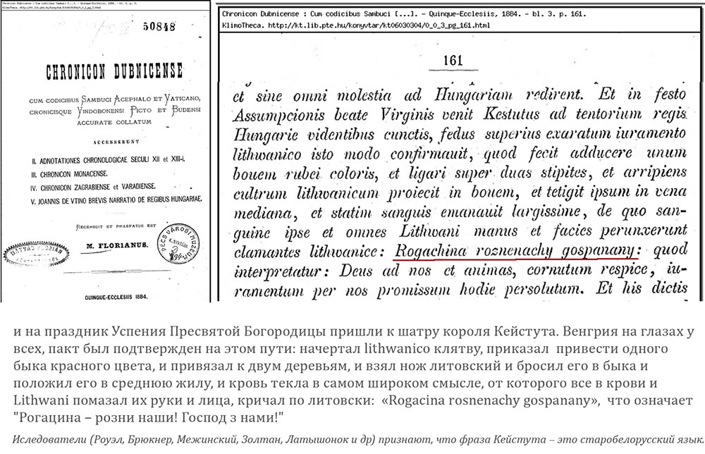 В 1351 году войско литвинов из Бреста, Дорогичина, Гродно и Трок во главе с Кейстутом вело войну на венгерской границе. В итоге договорились о перемирии с венгерским королём. Кейстут убил быка (rogacina) и при свидетелях прокричал клятву "Рогацина — розни наши! Господ з нами!", что было громко повторено литвинами (Lithwani).