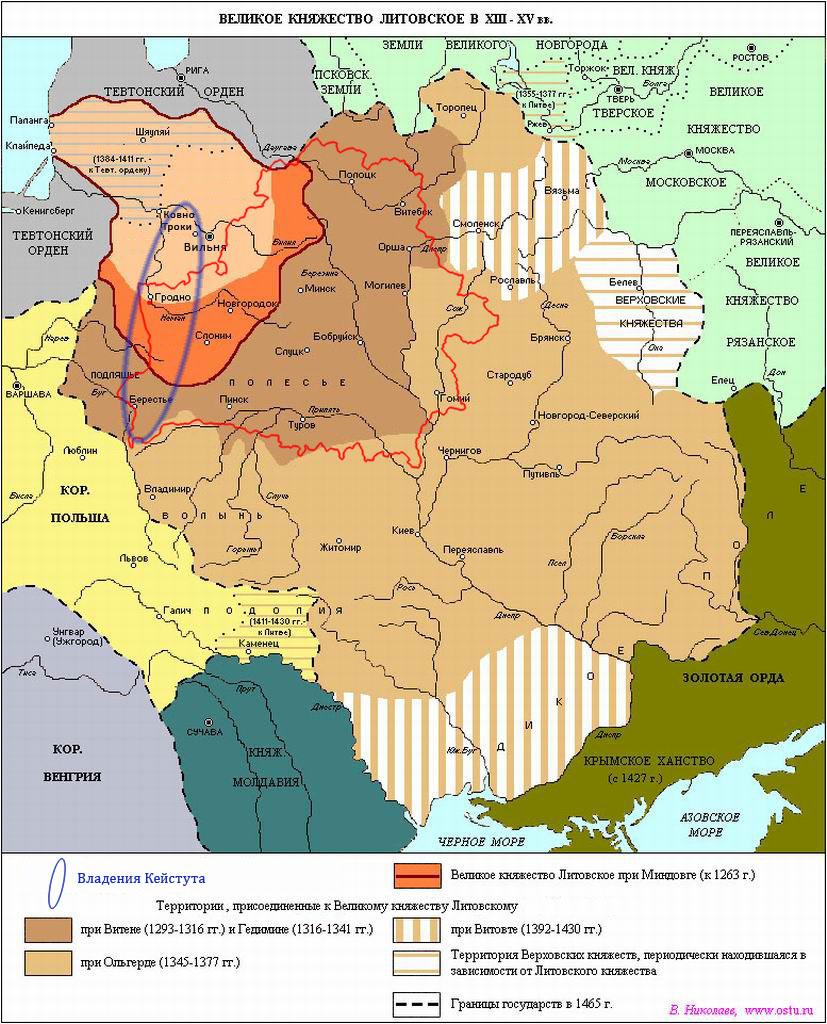 Кейстут (1297-15.08.1382) — сын великого князя литовского Гедемина, брат и фактический соправитель Ольгерда, отец Витовта. Еще при жизни отца получил в удел Жмудь, Троки, Гродно и Берестье — узкую и длинную полосу вдоль западного рубежа ВКЛ, прилегавшую к владениям Тевтонского ордена и Мазовии.