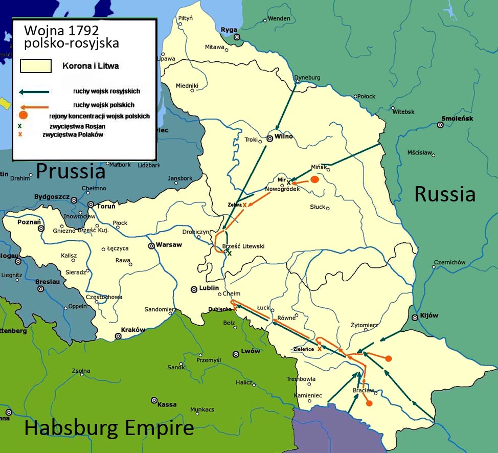 1792 Создана Тарговицкая конфедерация — движение магнатов под покровительством России, направленное против реформ. На помощь конфедератам в Речь Посполитую вторгаются российские войска. Тадеуш Костюшко командует войсками в битве под Дубенкой (18 июля) — одном из ключевых сражений войны 1792 года — битве против пятикратно превосходящих сил врага (5 тыс. у Костюшко против 25 тыс. российских). После битвы король польский и в. князь литовский Станислав Август Понятовский повысил Тадеуша Костюшко до звания генерал-лейтенанта и наградил орденом Белого орла.
