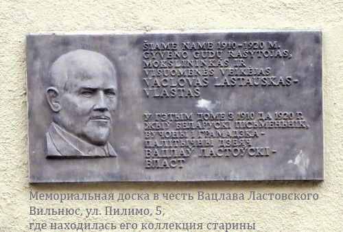[ Даже в годы Первой мировой войны, в частности в 1916 году, в редактируемой Ластовским газете "Гоман" можно было увидеть объявления: "Купляю ўсякiе старасьвецкiе рэчы: абразы, гравюры, мiнiатюры, рукапiсы i кнiжкi XV i XVI в.; порцэляну, шкло, тканiны. В. Ластоўскi. Завальная вулiца № 7. "Беларуская кнiгарня". ]