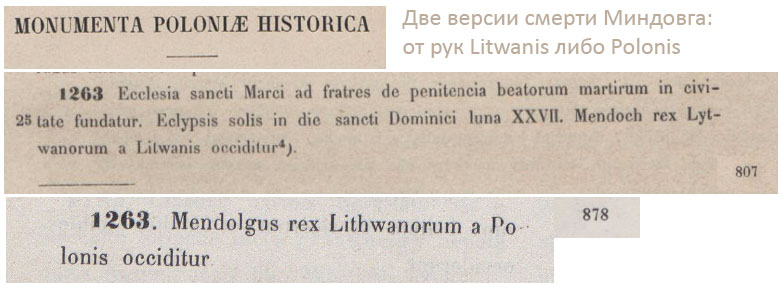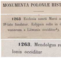В 1263 году Миндовг был убит (Rex Mendoch occiditur). По одним источникам поляками, по другим — литвинами